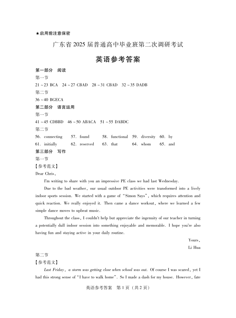 广东省2025届普通高中毕业班第二次调研考试英语答案