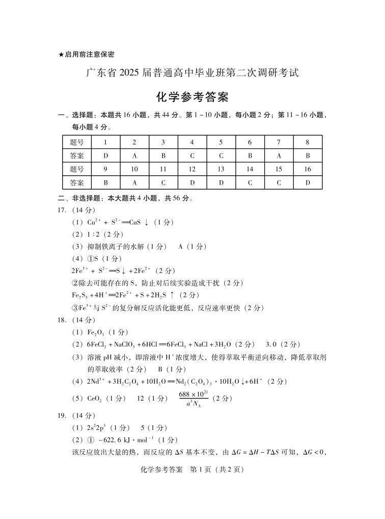 广东省2025届普通高中毕业班第二次调研考试化学答案