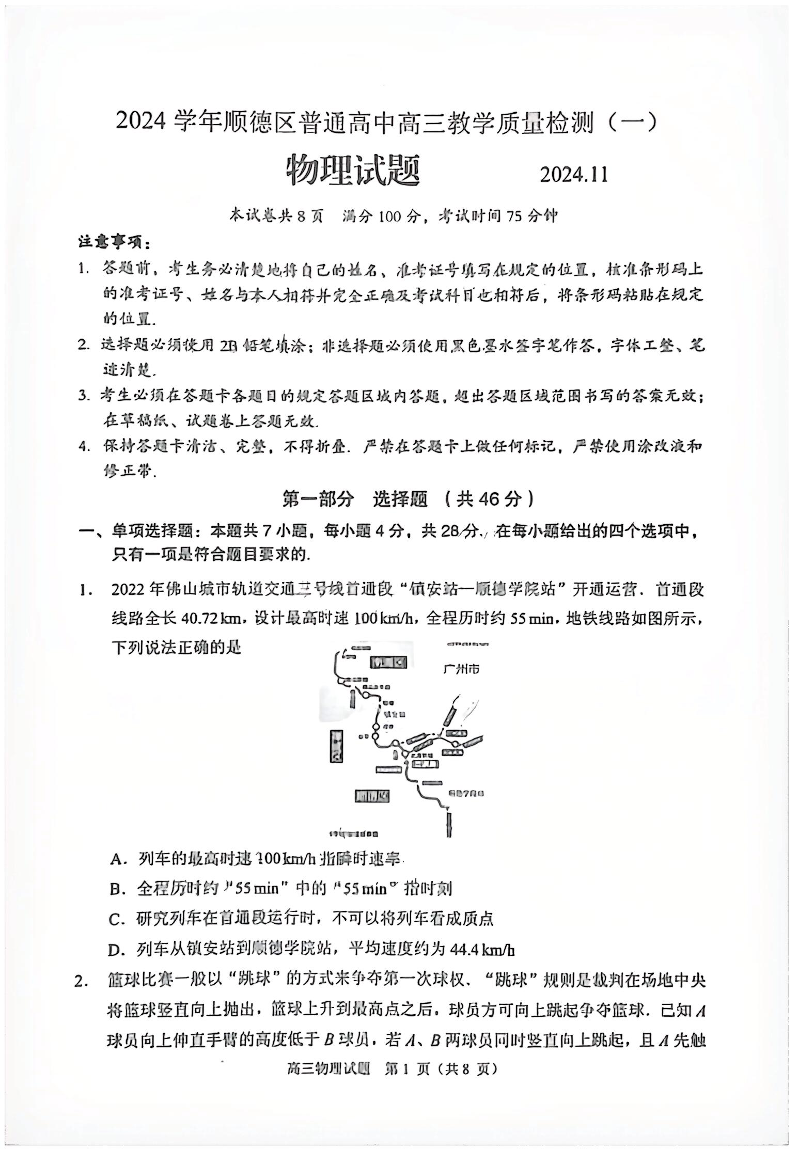 广东省佛山市2024学年顺德区普通高中高三教学质量检测(一)物理及答案