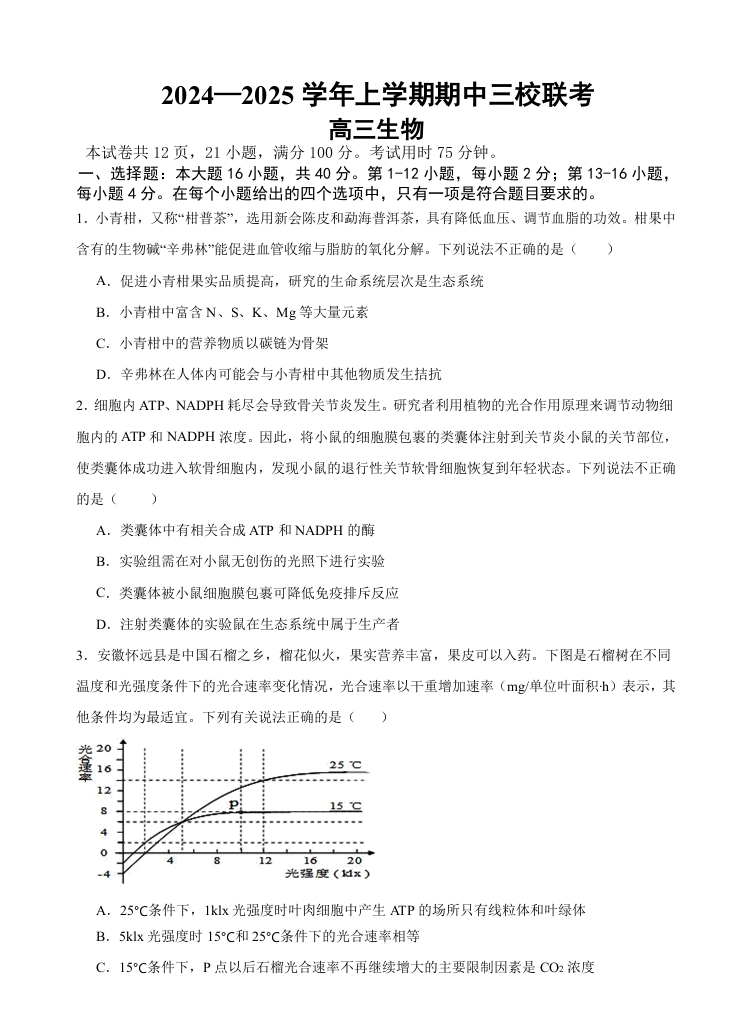 广东省广州外国语、广大附中、铁一中学等三校2025届高三上学期期中联考生物及答案