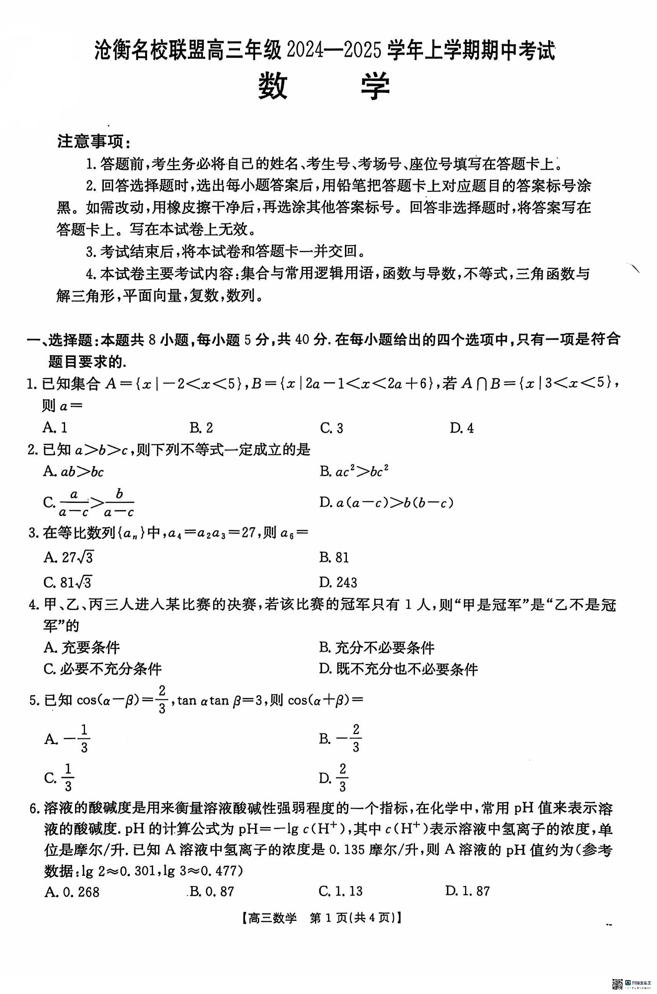 河北省沧衡名校联盟2024-2025学年高三11月期中考试数学