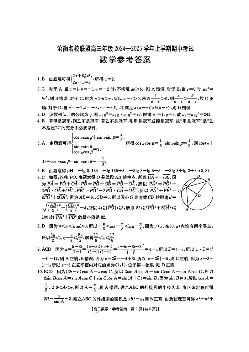 河北省沧衡名校联盟2024-2025学年高三11月期中考试数学答案