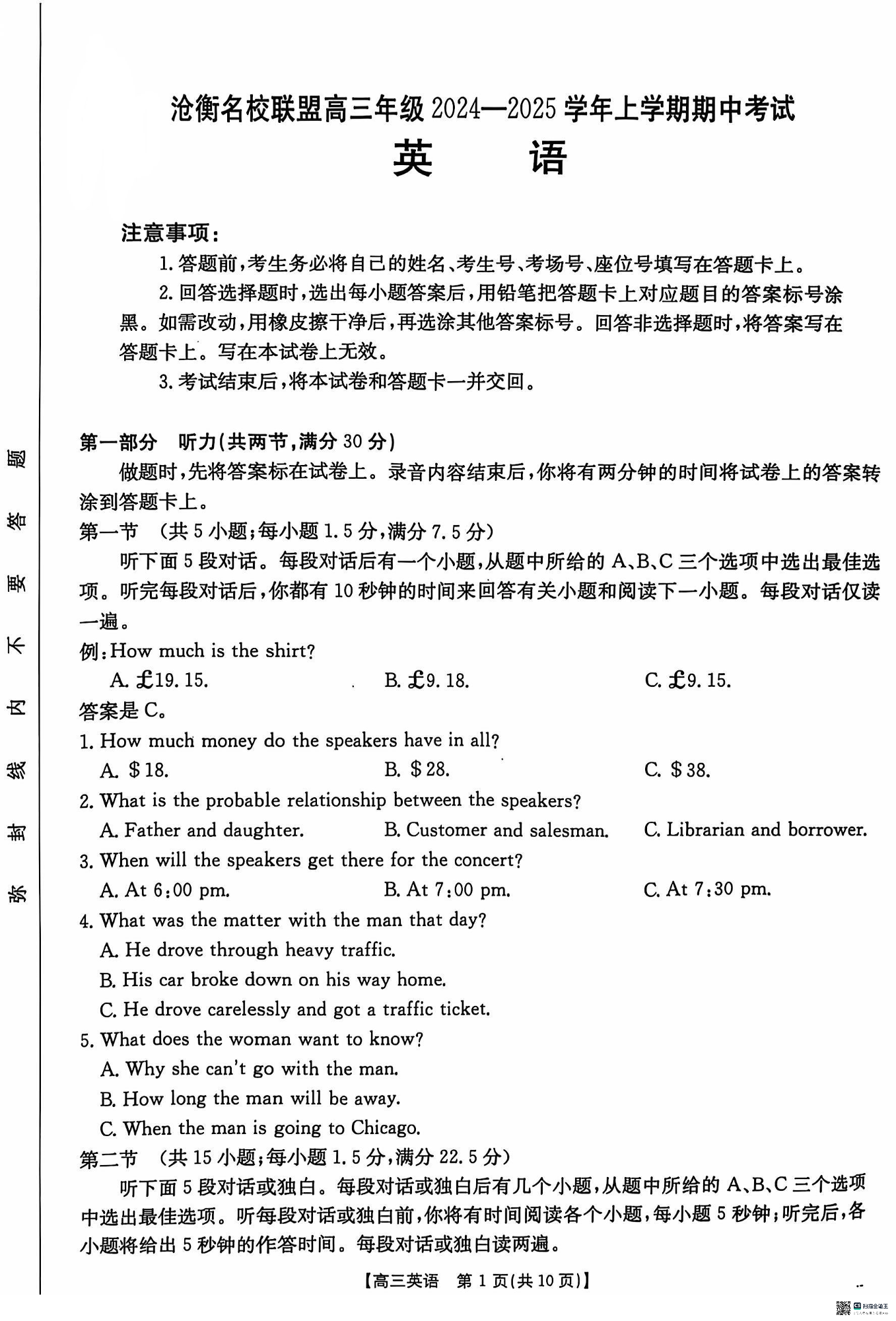 河北省沧衡名校联盟2024-2025学年高三11月期中考试英语