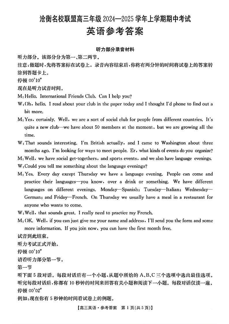 河北省沧衡名校联盟2024-2025学年高三11月期中考试英语答案