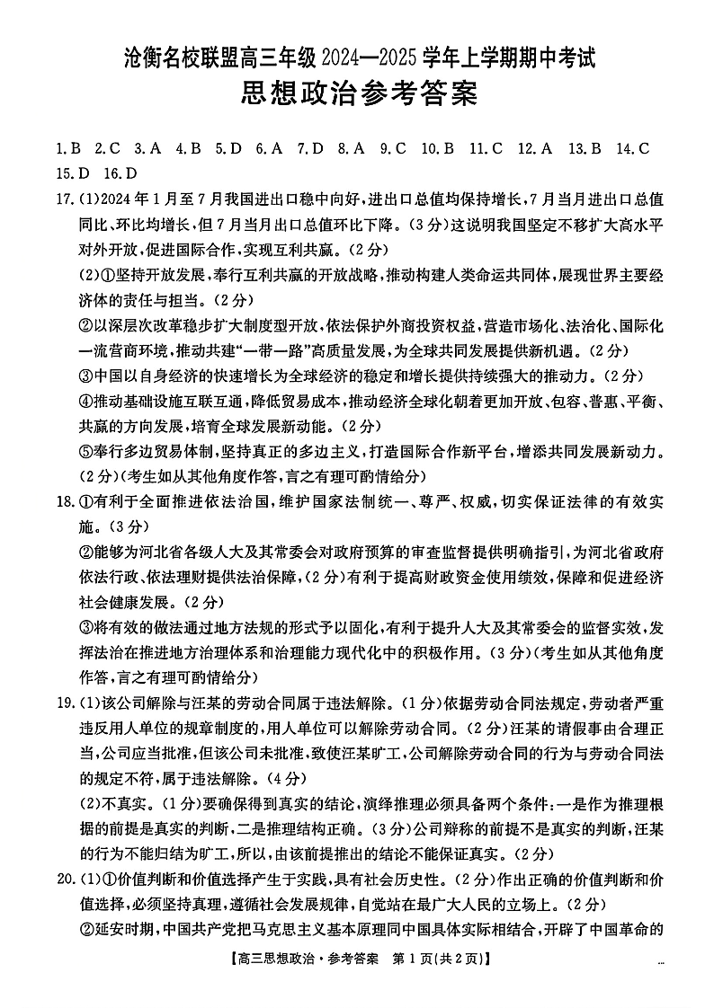 河北省沧衡名校联盟2024-2025学年高三11月期中考试政治答案