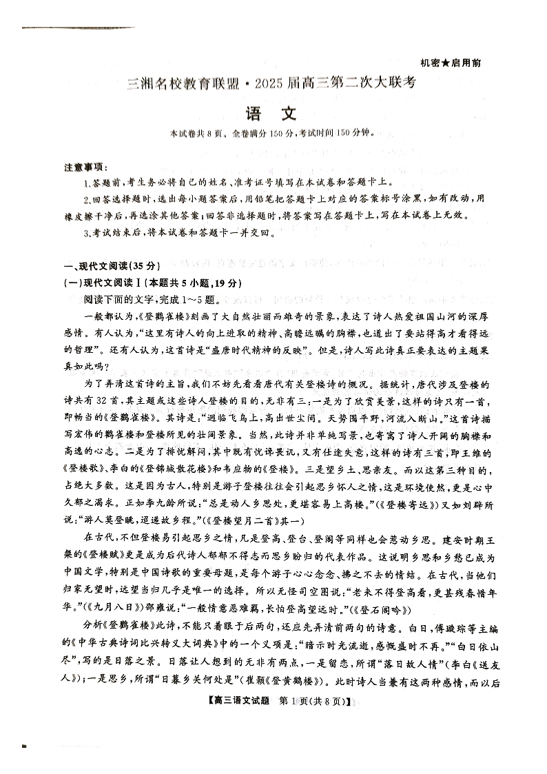 湖南省天壹名校联盟2025届高三第二次大联考语文