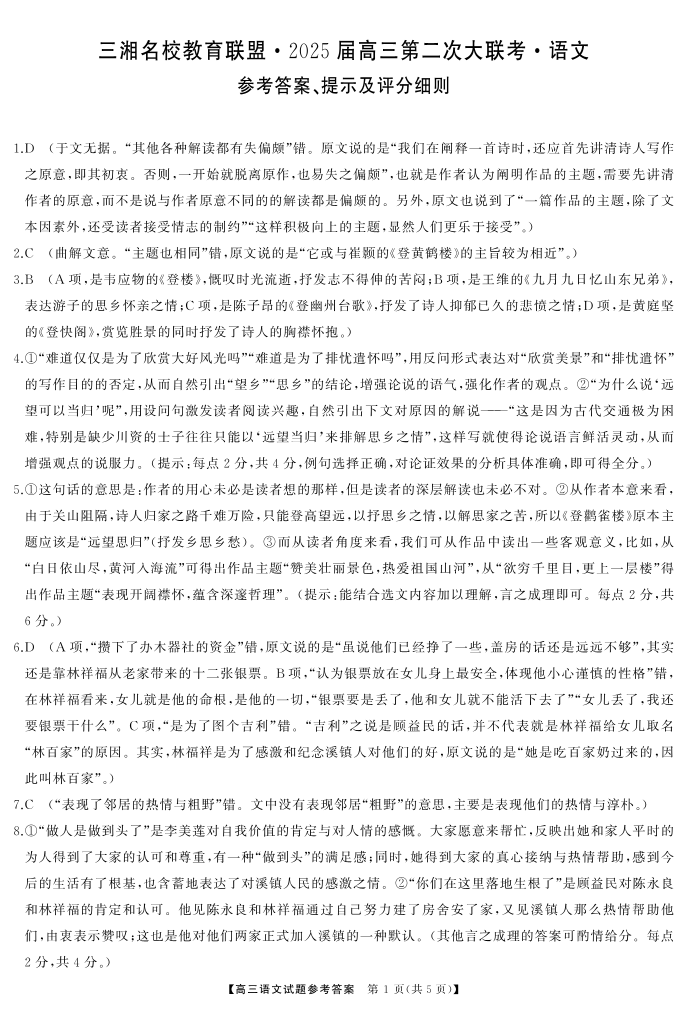 湖南省天壹名校联盟2025届高三第二次大联考文答案