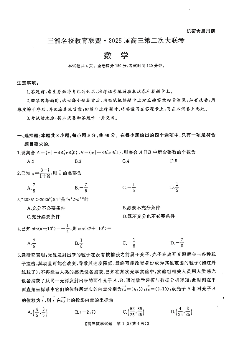 湖南省天壹名校联盟2025届高三第二次大联考数学