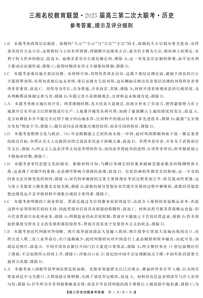 湖南省天壹名校联盟2025届高三第二次大联考历史答案