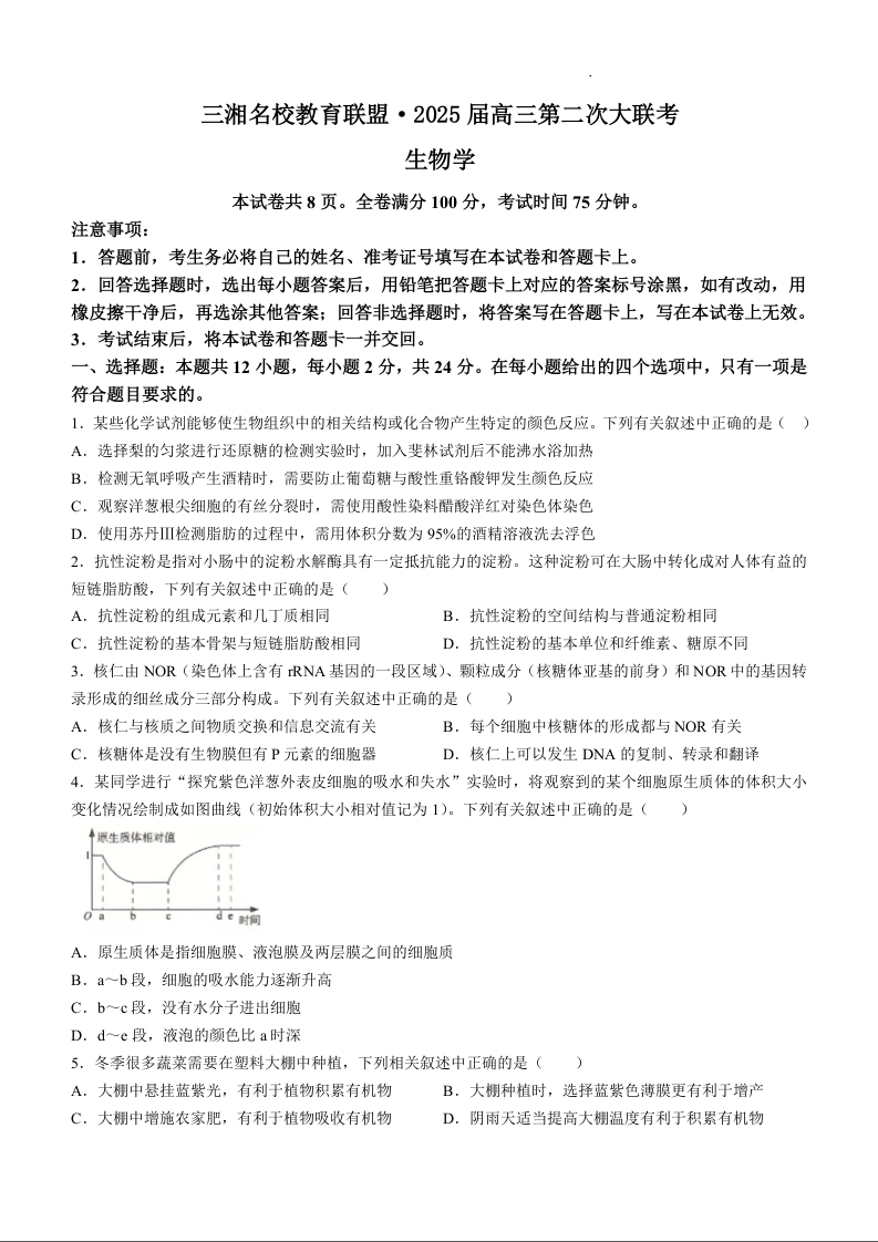 湖南省天壹名校联盟2025届高三第二次大联考生物