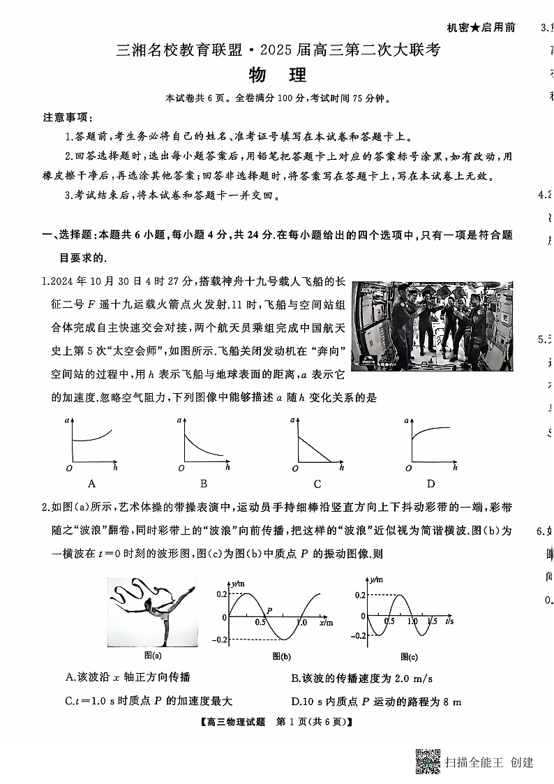 湖南省天壹名校联盟2025届高三第二次大联考物理