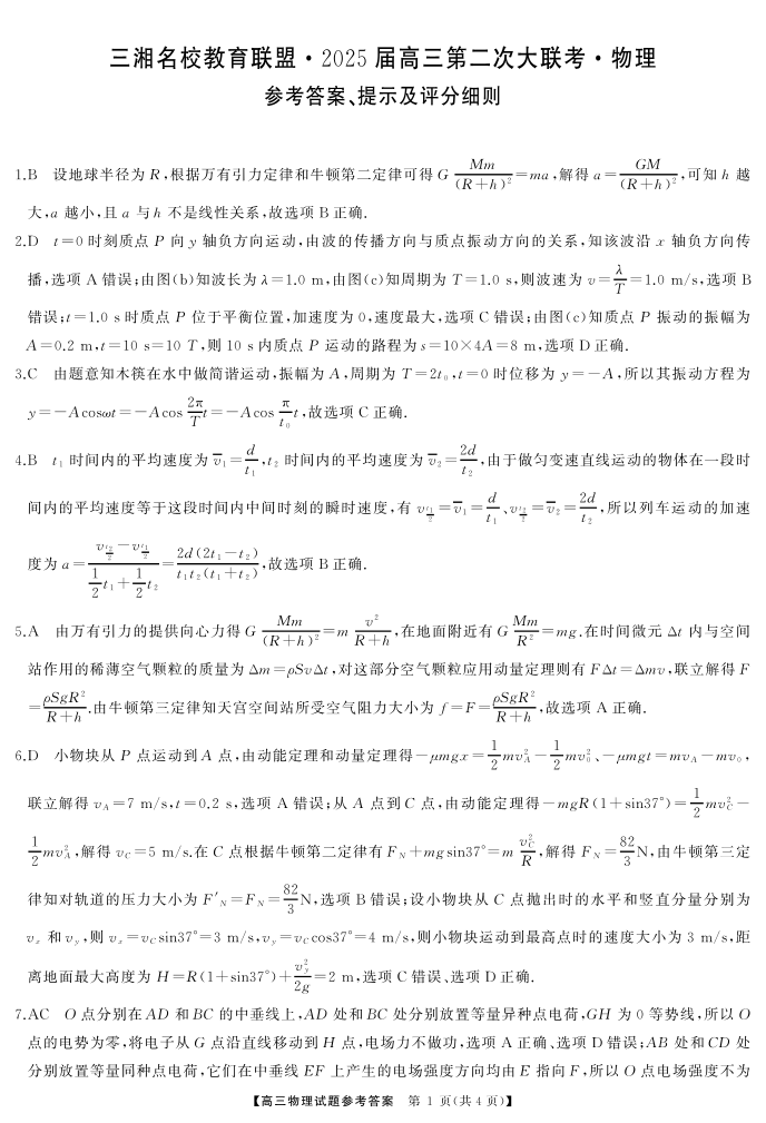 湖南省天壹名校联盟2025届高三第二次大联考物理答案