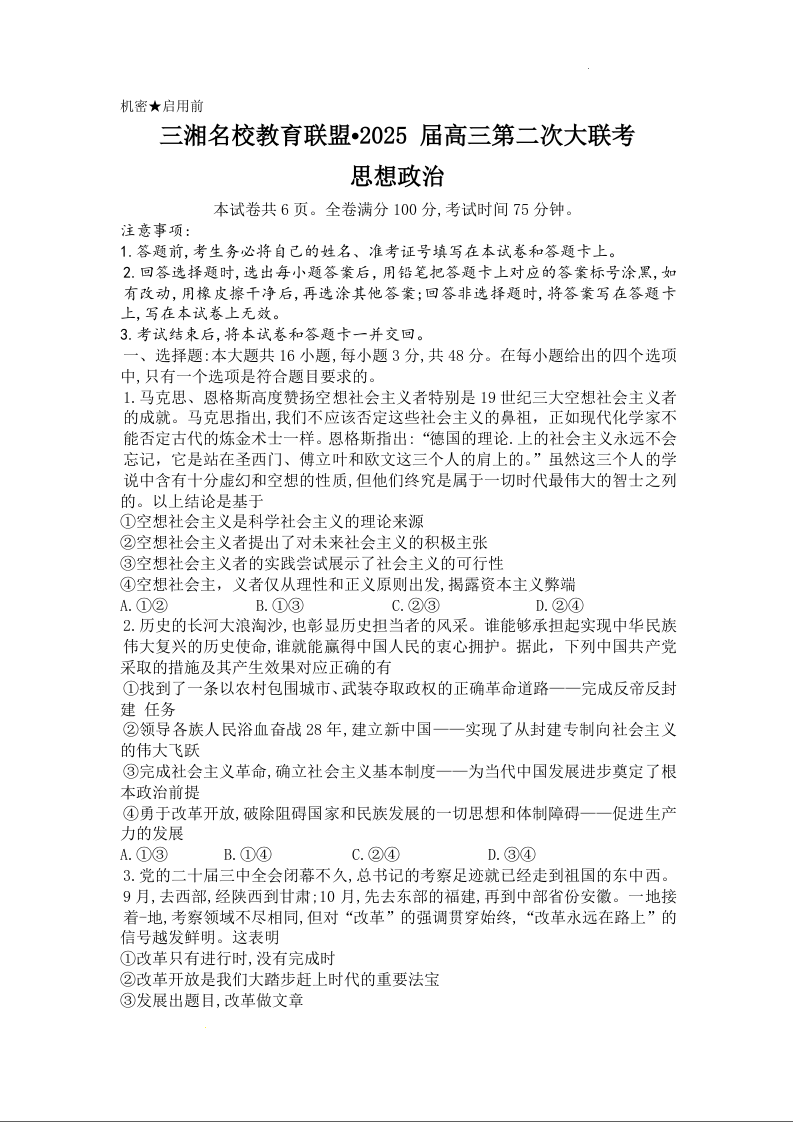 湖南省天壹名校联盟2025届高三第二次大联考政治