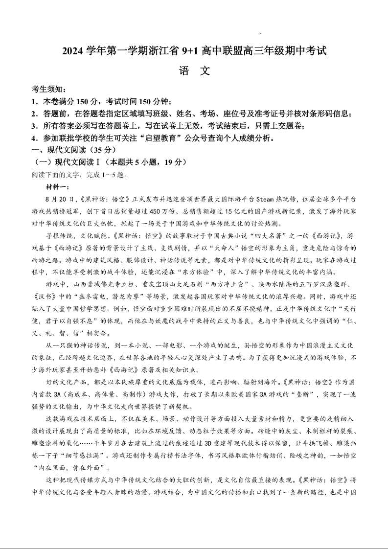 浙江省9+1高中联盟2025届高三上学期11月期中考试语文+答案
