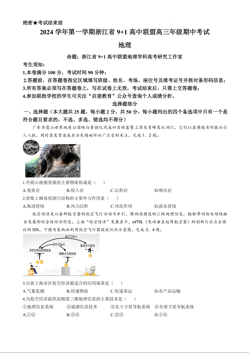 浙江省9+1高中联盟2025届高三上学期11月期中考试地理+答案