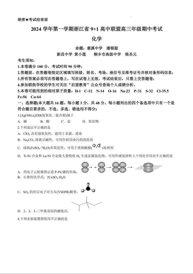 浙江省9+1高中联盟2025届高三上学期11月期中考试化学+答案