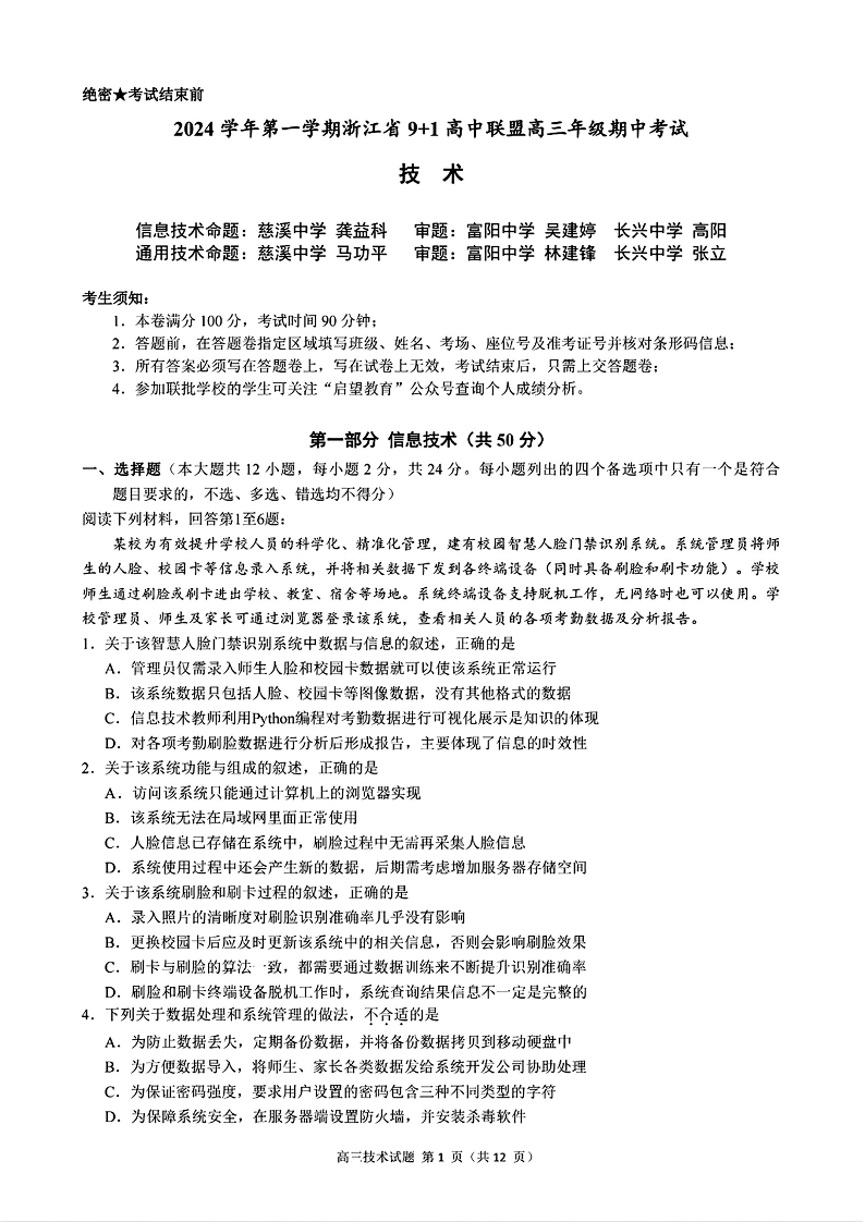 浙江省9+1高中联盟2025届高三上学期11月期中考试技术+答案