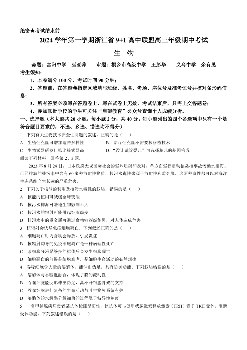 浙江省9+1高中联盟2025届高三上学期11月期中考试生物+答案