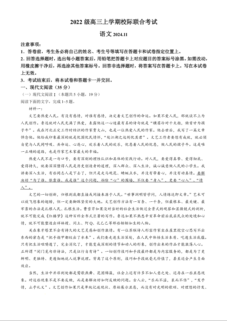 山东省日照市校际联合考试2025届高三上学期11月期中考试语文