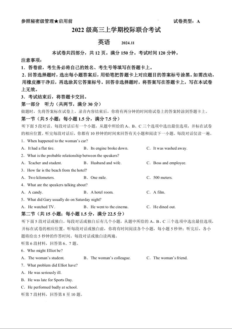 山东省日照市校际联合考试2025届高三上学期11月期中考试英语