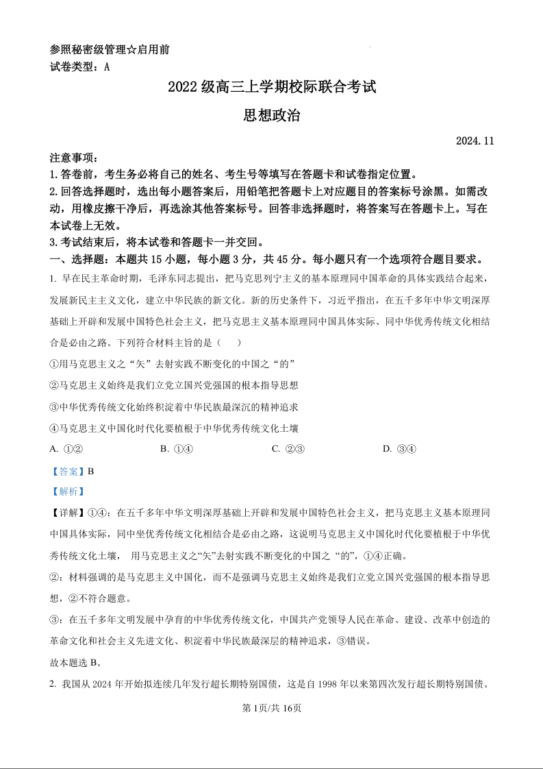 山东省日照市校际联合考试2025届高三上学期11月期中考试政治(精品解析版)