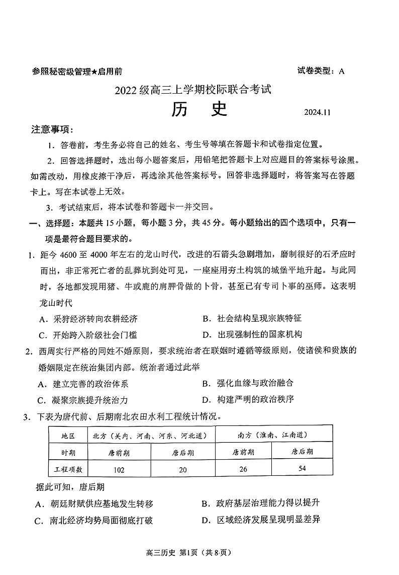 山东省日照市校际联合考试2025届高三上学期11月期中考试历史
