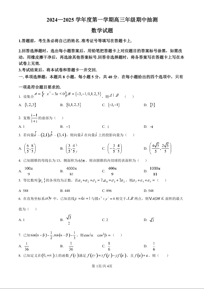 江苏省徐州市2025届高三上学期11月期中考试数学(原卷版)