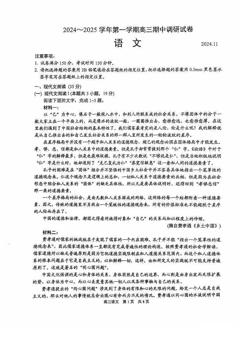 江苏省苏州市2025届高三上学期11月期中调研语文