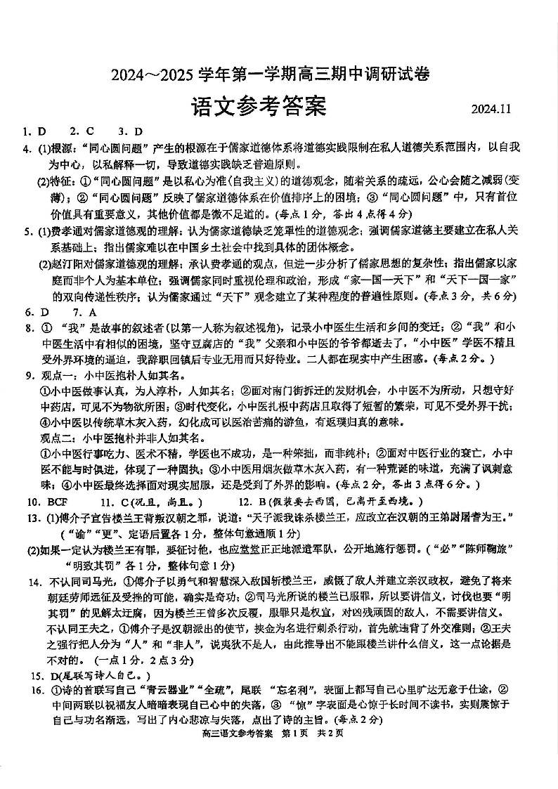 江苏省苏州市2025届高三上学期11月期中调研语文答案