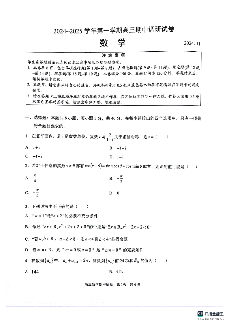 江苏省苏州市2025届高三上学期11月期中调研数学