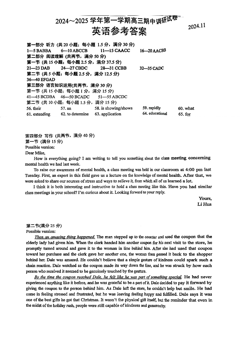 江苏省苏州市2025届高三上学期11月期中调研英语答案