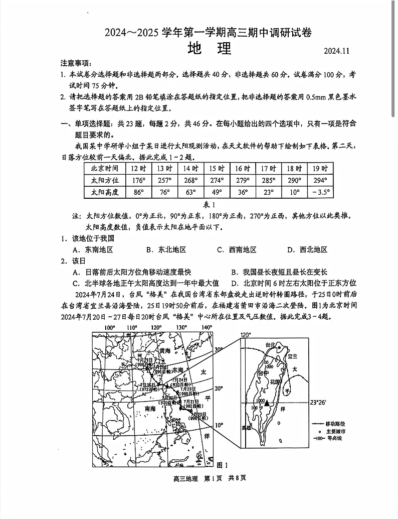 江苏省苏州市2025届高三上学期11月期中调研地理