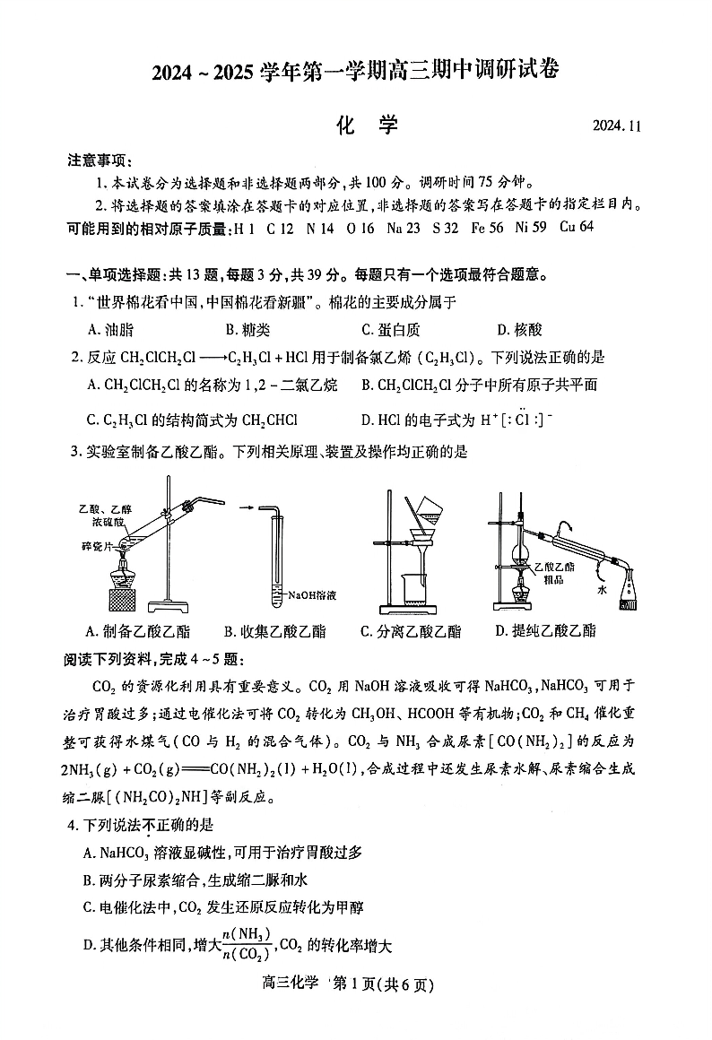 江苏省苏州市2025届高三上学期11月期中调研化学