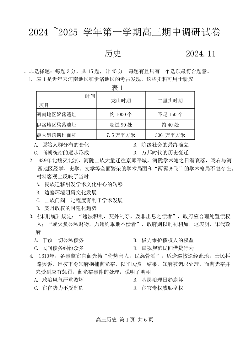 江苏省苏州市2024-2025学年高三上学期期中考试历史+答案