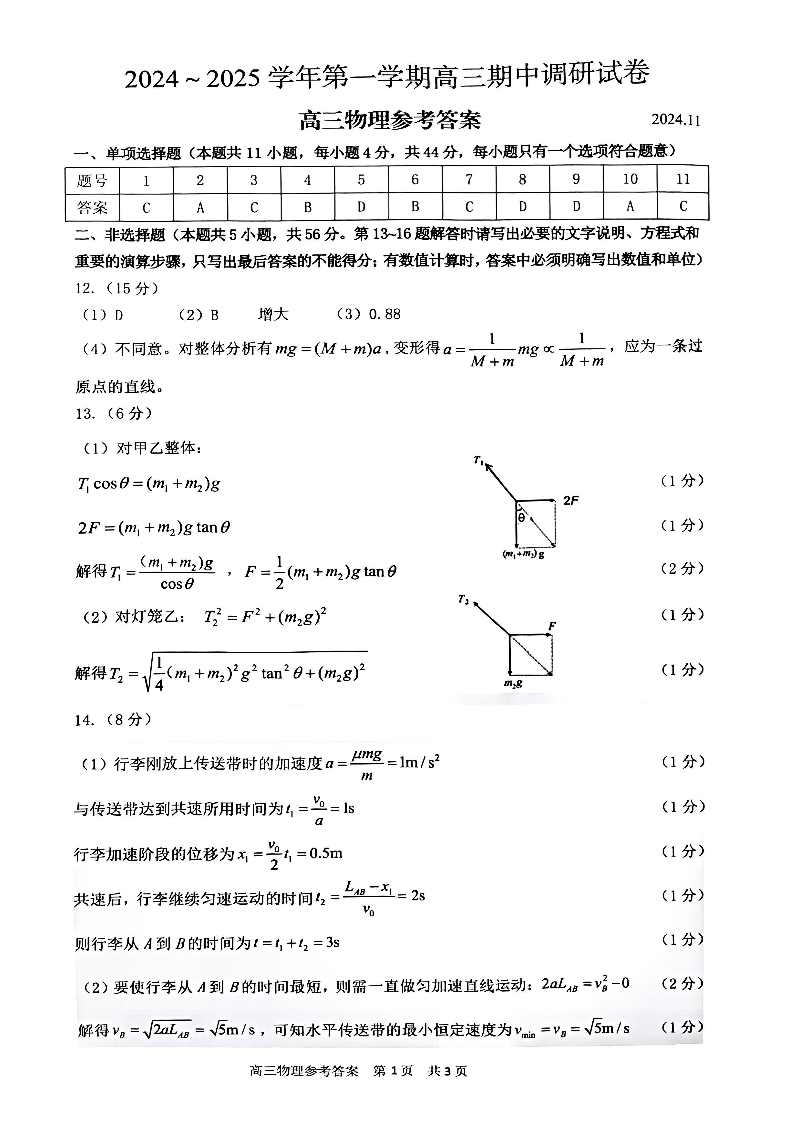 江苏省苏州市2025届高三上学期11月期中调研物理答案