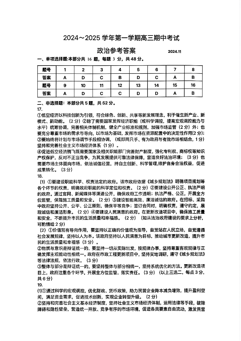江苏省苏州市2025届高三上学期11月期中调研政治答案