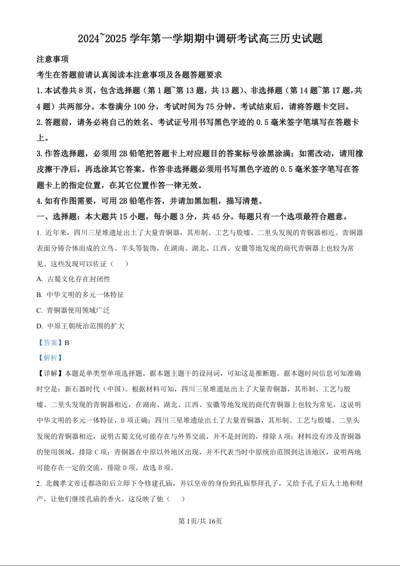 江苏省连云港市2025届高三上学期11月期中考试历史(精品解析版)