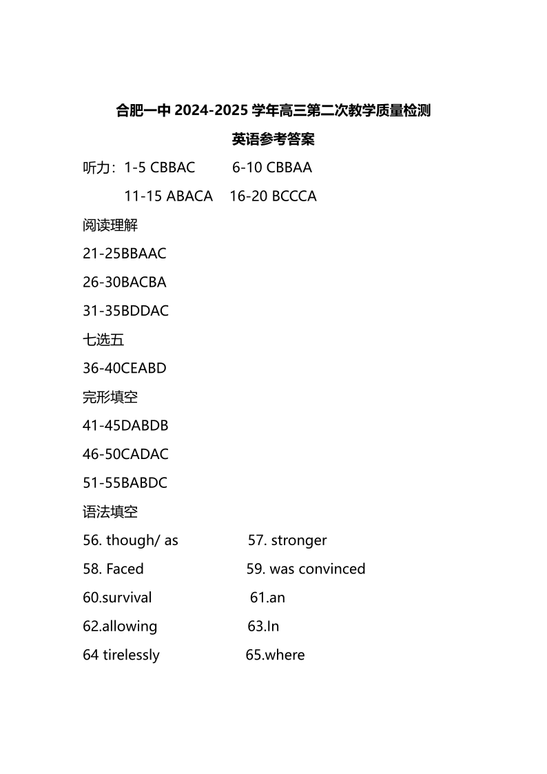 安徽省合肥市第一中学2025届高三上学期第二次教学检测英语答案(十联考)