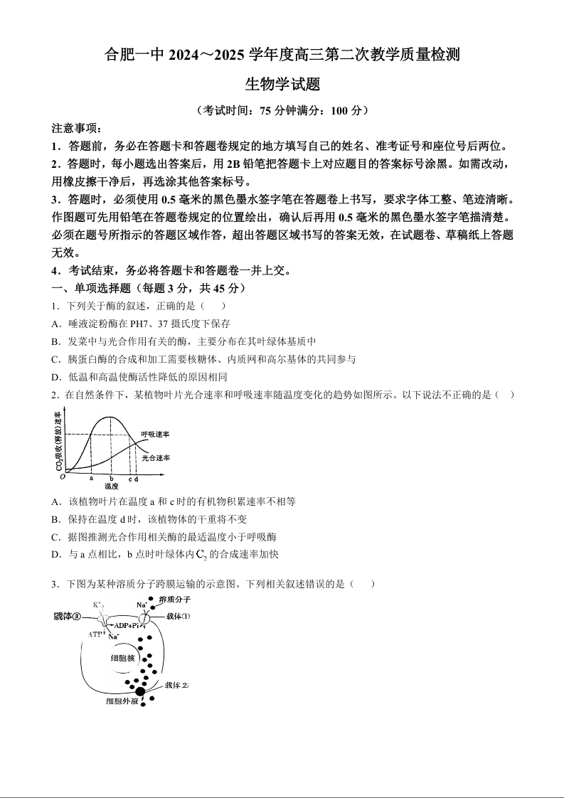安徽省合肥市第一中学2025届高三上学期第二次教学检测生物(十联考)