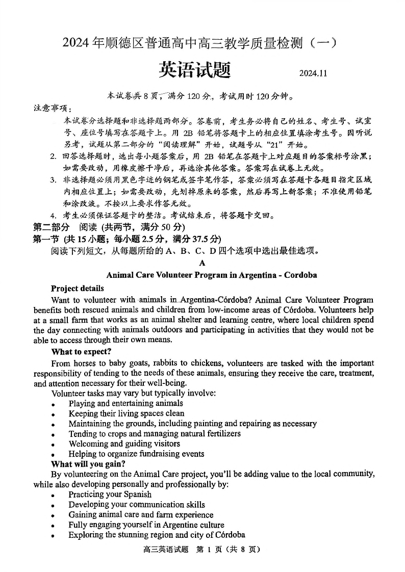 广东省佛山市2024学年顺德区普通高中高三教学质量检测(一) 英语