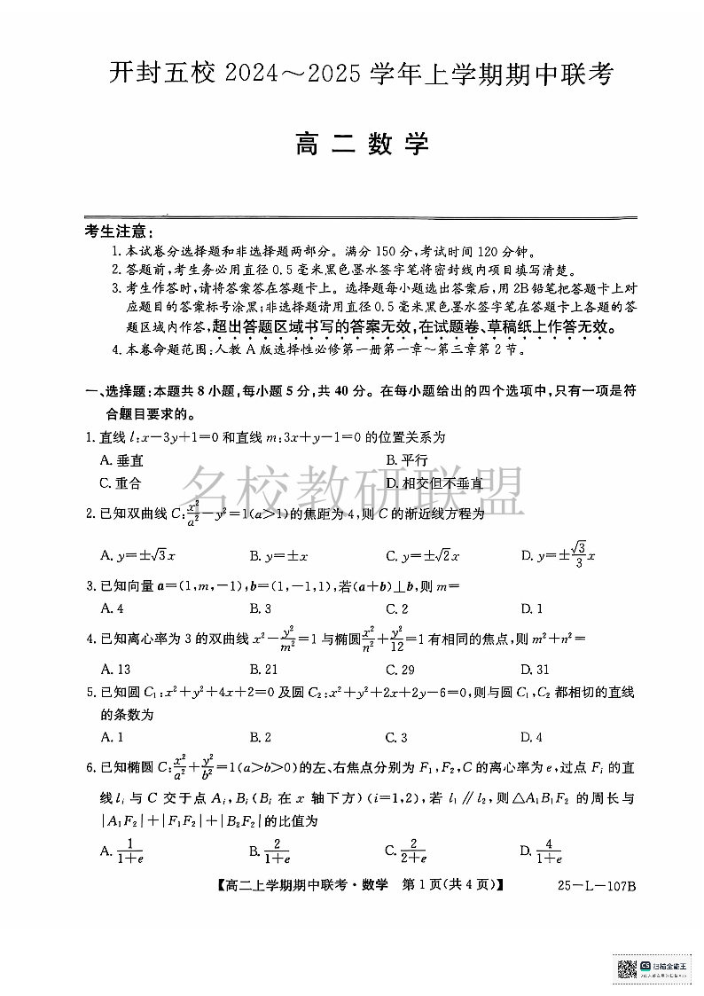河南省开封五校2024-2025学年高二11月期中联考 数学