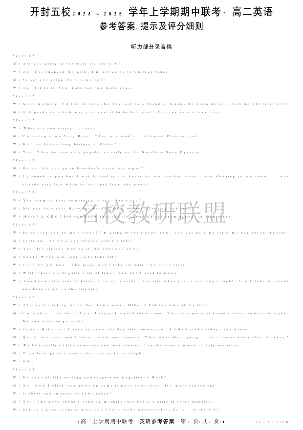 河南省开封五校2024-2025学年高二11月期中联考 英语答案