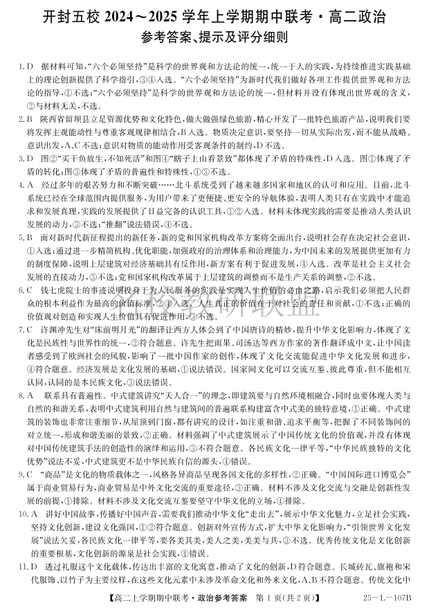 河南省开封五校2024-2025学年高二11月期中联考 政治答案