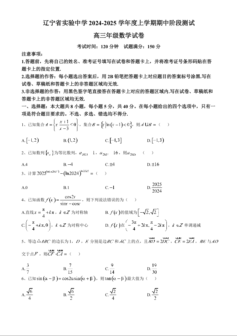 辽宁省实验中学2024-2025学年度高三上学期期中阶段测试 数学