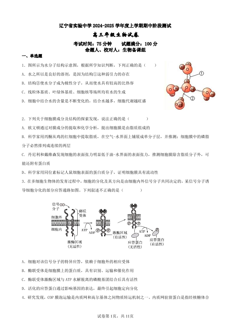 辽宁省实验中学2024-2025学年度高三上学期期中阶段测试 生物