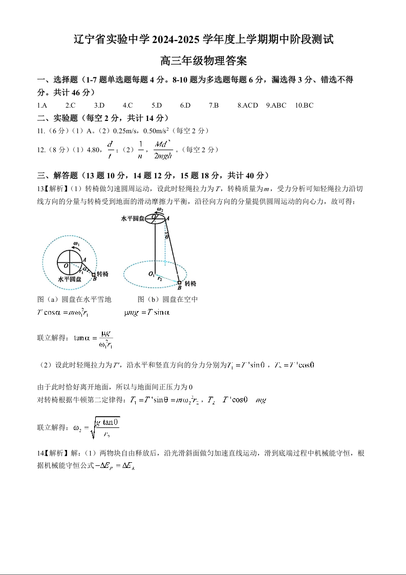 辽宁省实验中学2024-2025学年度高三上学期期中阶段测试 物理答案