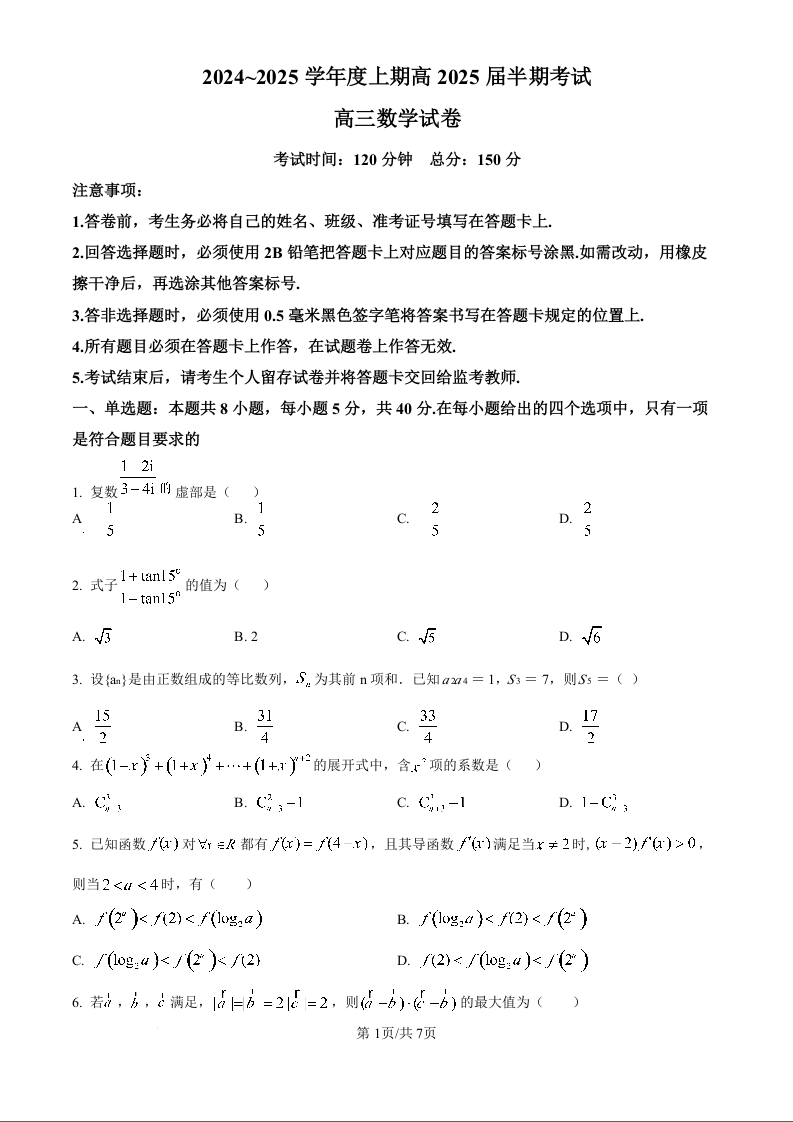 四川省成都市第七中学2024~2025学年度上期高2025届半期考试数学及答案