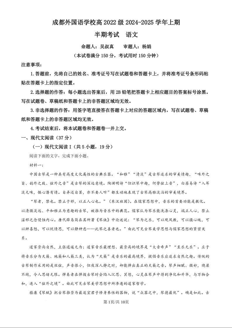 四川省成都外国语学校2025届高三上学期11月期中考试语文