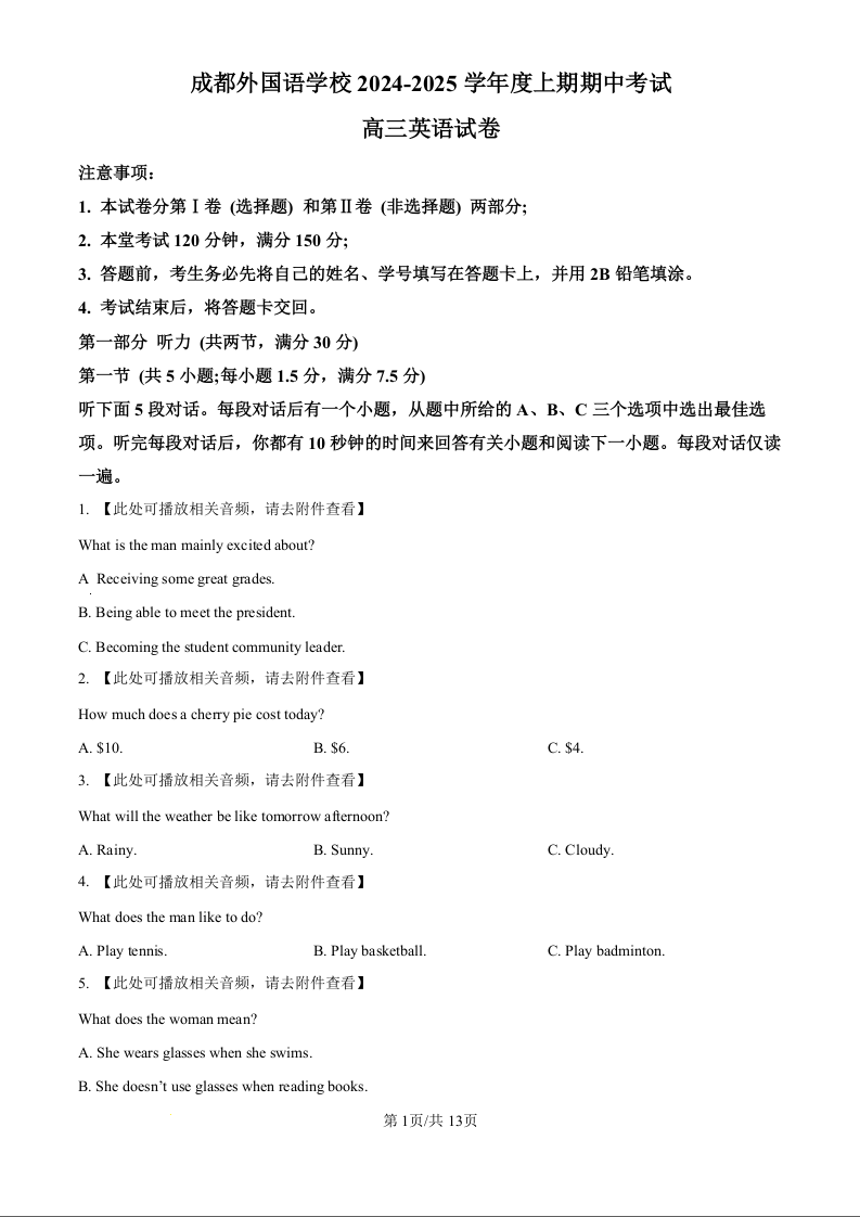 四川省成都外国语学校2025届高三上学期11月期中考试英语