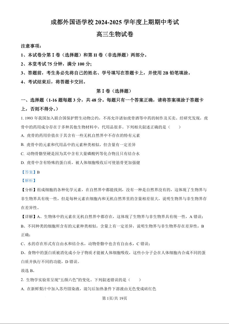 四川省成都外国语学校2025届高三上学期11月期中考试生物答案